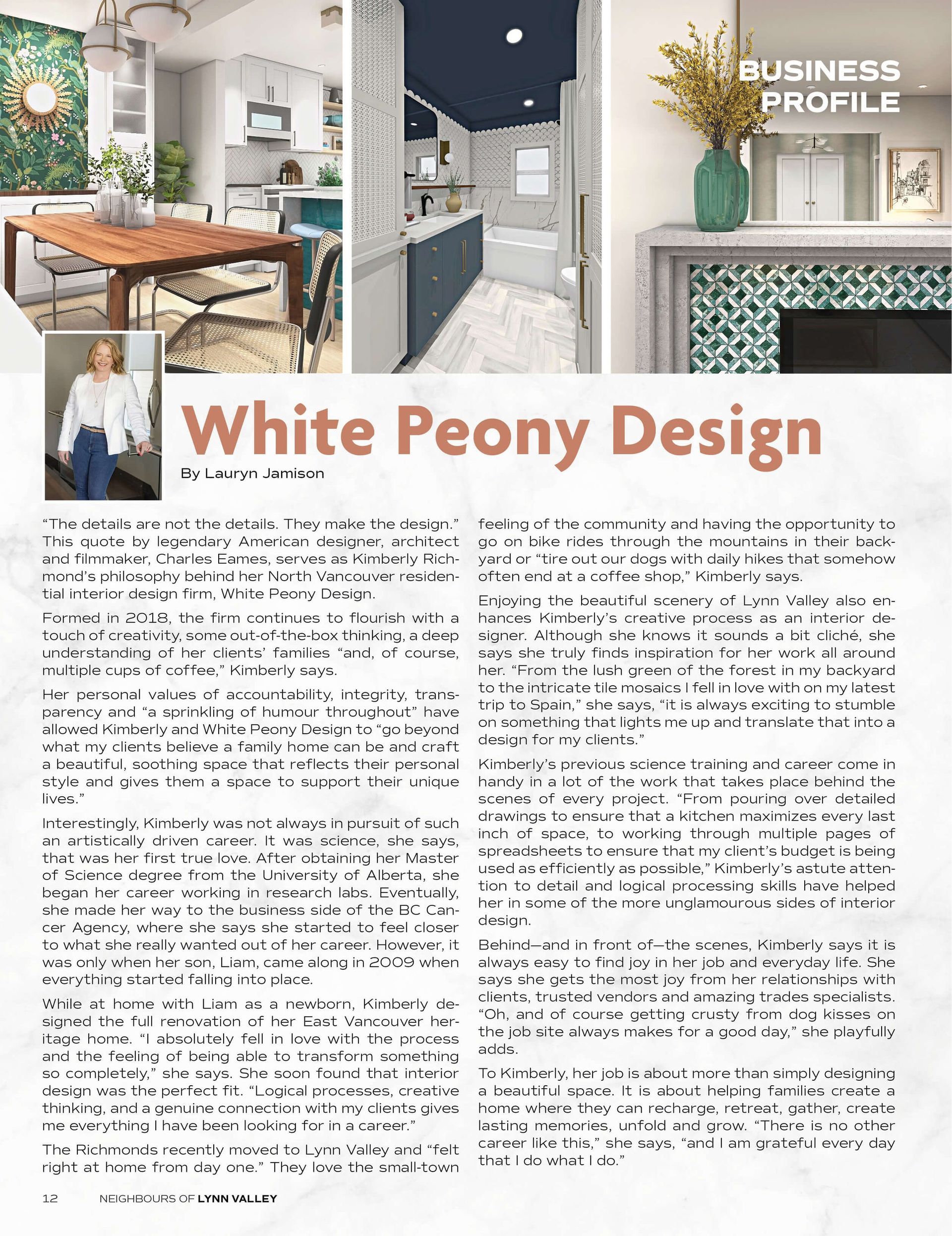 At White Peony Design, we specialize in family-first interiors that celebrate both style and substance. Led by Kimberly Richmond, we serve busy families and professionals across North Vancouver, West Vancouver, and beyond. Our process is warm, transparent, and tailored to you—from the first consultation through to the final reveal. We believe a beautiful home shouldn’t mean sacrificing comfort or durability. Whether you’re updating a tired room or managing a full-scale renovation, we guide every step with creativity, clarity, and care.
